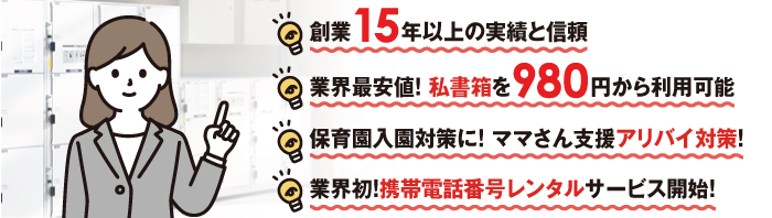 業界最安値!980円〜私書箱利用可能!創業15年以上の実績と信頼!保育園入園のアリバイ対策可能!